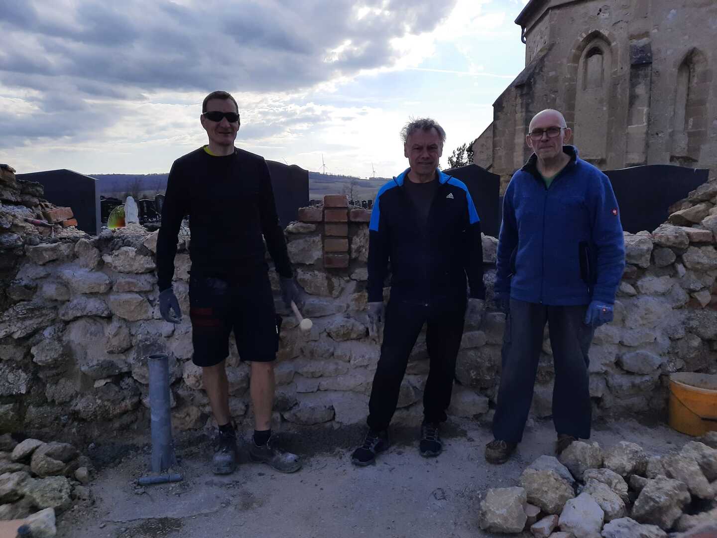 Nach rund 55 investierten Arbeitsstunden war die Friedhofsmauer bereits wieder aufgemauert. Besonders zeitintensiv gestaltete sich das beidseitige Verfugen des Natursteinmauerwerks. Anschließend wurde die Mauer gereinigt.